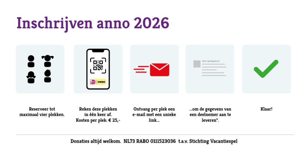 Met dank aan onze sponsoren kunnen we het inschrijfgeld laag houden. Het inschrijfgeld voor Het VakantieSpel 2026 is € 25,– per deelnemer. - Stap 3: Ontvang per plek een e-mail met link naar het deelnemersformulier